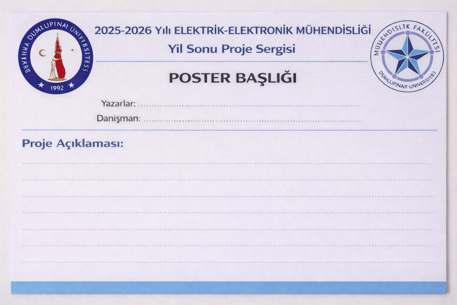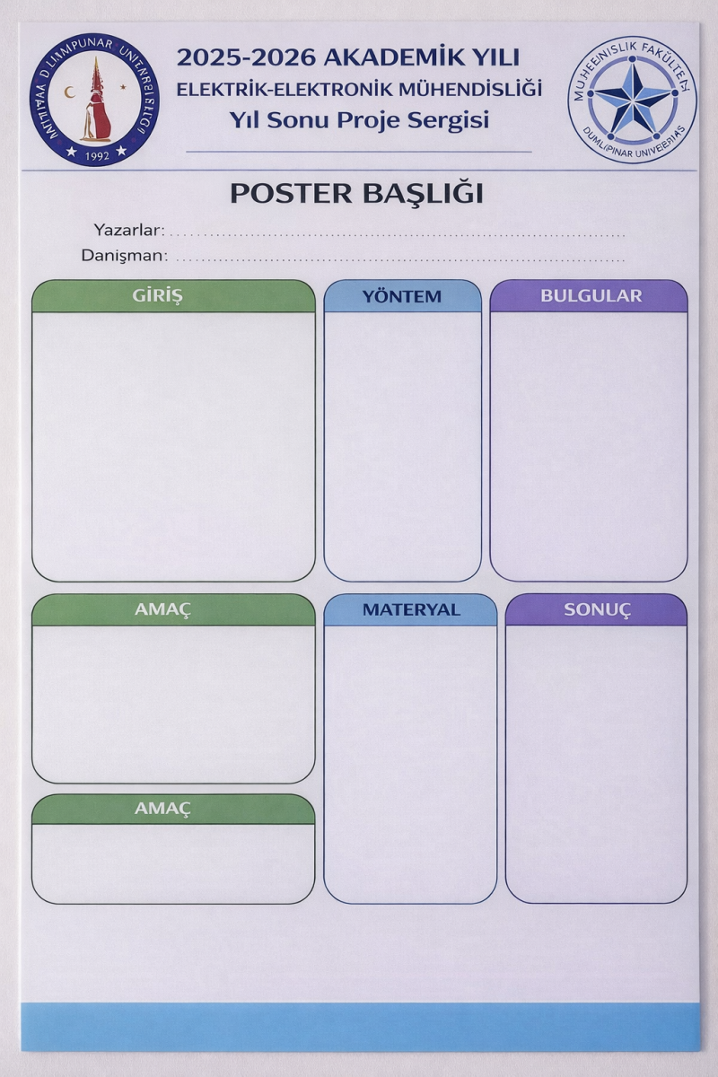 2025-2026 akademik yılı yıl sonu proje sergisi için poster hazırlamak isteyen öğrencilerimiz aşağıda verilen formatlarda posterlerini hazırlayacaklardır. Posterler A2 (42 × 59,4 cm) formatta dikey biçimde olacaktır ve proje hakkında açıklamaların bulunduğu kutucuklar isteğinize göre değiştirilebilecektir. Posterde yazı boyutu 28 pt Times New Roman yazı tipinde olacaktır. Proje açıklaması ise A4 (21 x 29,7 cm) boyutunda olacaktır ve yazı boyutu 14 pt Times New Roman olacaktır. Logolardaki yazılar okunur biçimde olacaktır. Sergi ile ilgili sorularınızı Arş. Gör. Gökhan ŞAHİN’e danışabilirsiniz.