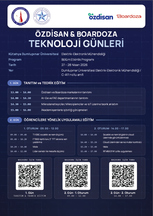 Bölümümüz ev sahipliğinde, Özdisan ve Boardoza iş birliğiyle düzenlenecek olan "Teknoloji Günleri" etkinliği 27–28 Nisan 2026 tarihlerinde C-A11 no'lu amfide gerçekleştirilecektir.